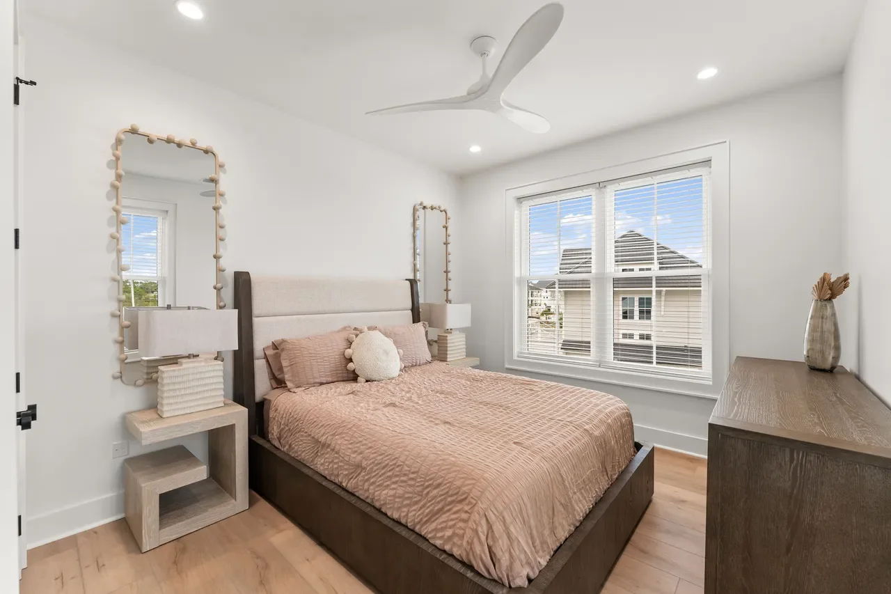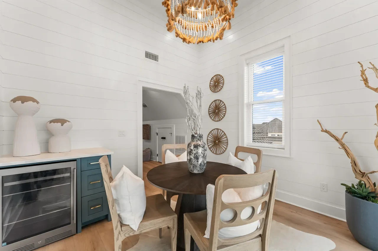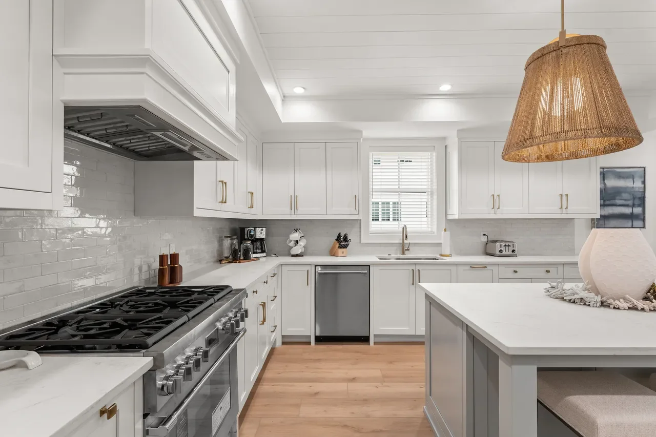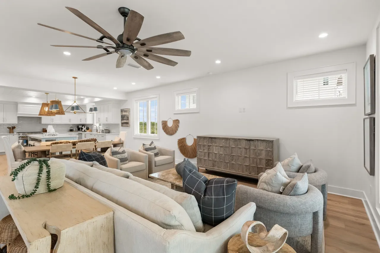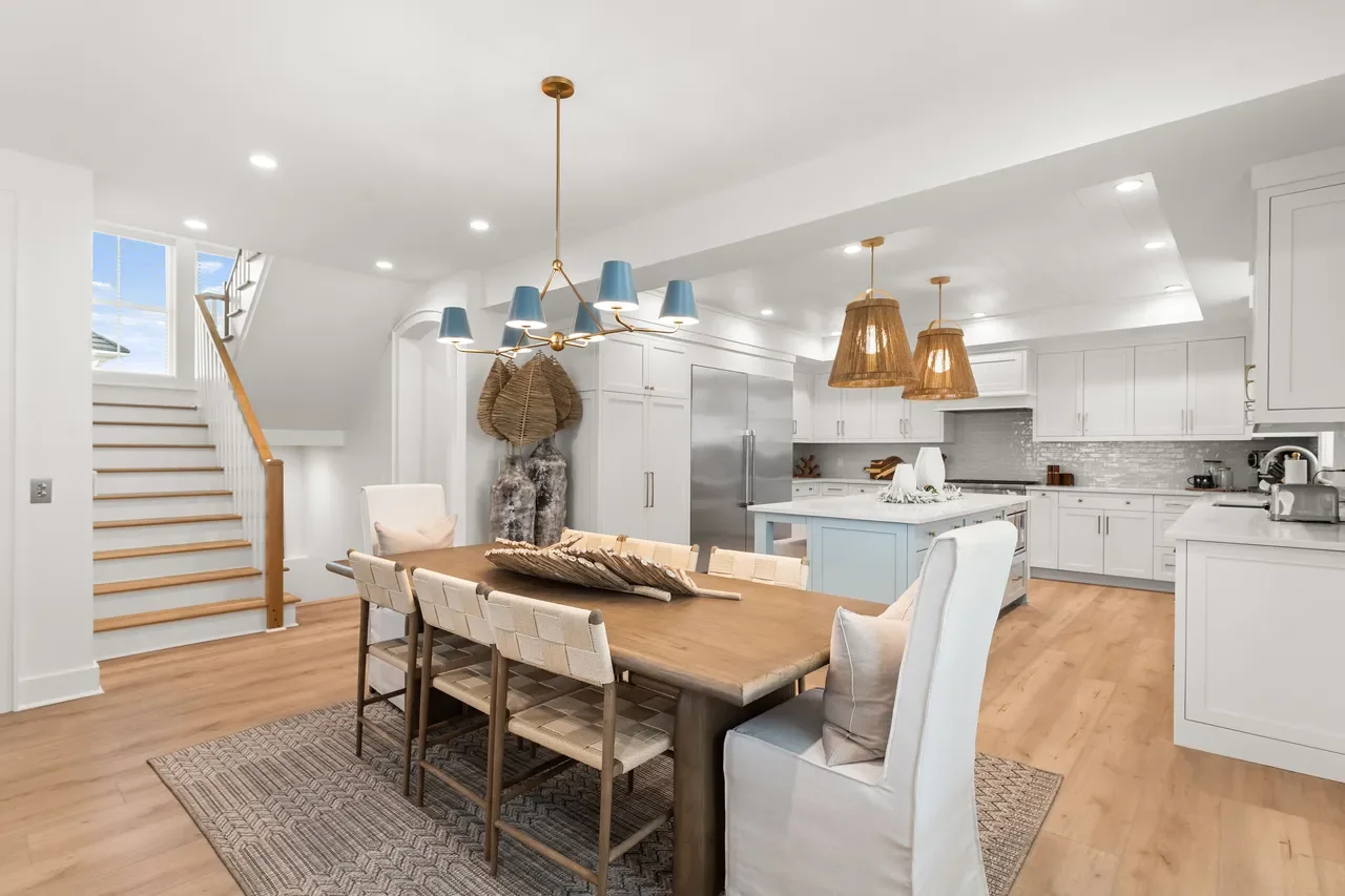 The main living level is airy and inviting, wrapped in soft coastal tones and anchored by an open chef’s kitchen with quartz surfaces, a generous island, premium appliances, and abundant storage. Recessed lighting, crown molding, intentional detailing, and curated furnishings elevate every space, creating a refined atmosphere suited for extended stays or high-demand rental appeal.